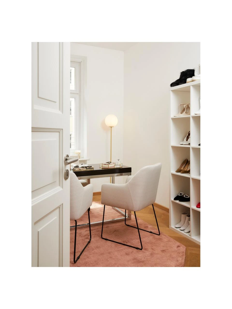 Der Armlehnstuhl wird platzsparend verpackt geliefert – nach Montage der Beine kann er sofort verwendet werden.