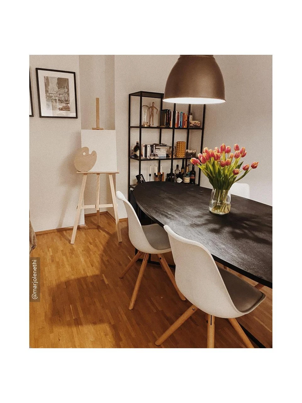 Der Esstisch wird platzsparend verpackt geliefert und benötigt als Montageaufwand das Anbringen des Gestells.